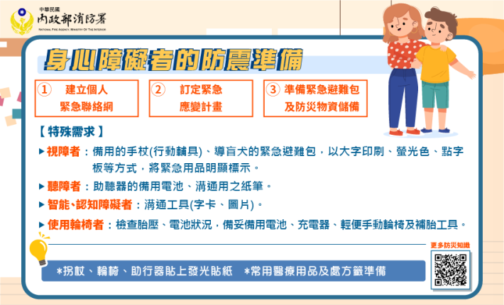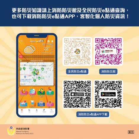 臺灣位處在高災害風險之地區,經常面臨颱風、地震、淹水、土石流及疫災等災害,全球於極端氣候下,災害規模已不可預測,複合型災害常造成大範圍淹水、大規模土石崩落、橋梁道路中斷,甚至住家停電缺水等災情,因應災害發生或疫情居家隔離時,如外界救援及物資運補難以抵,或是商店賣場物品食材毀損無法營業,交通物流中斷缺糧缺嚴重影響居家正常生活。避免上述情況發生,民眾應平時就做好各項防災準備,例如將家具事先固定、養成準備緊急避難包的習慣並定時清點,或利用每季及國家防災日之時機,並可搭配內政部消防署消防防災e點通APP(數位防災工具),此APP的使用提供個人化的災害示警推播、防災準備、避難處所查詢及AR避路徑指引、119報案及中央災害應變中心功能,一站式提供災智慧化資訊服務,也可以客製化個人的防災資訊,請民眾善加利用。